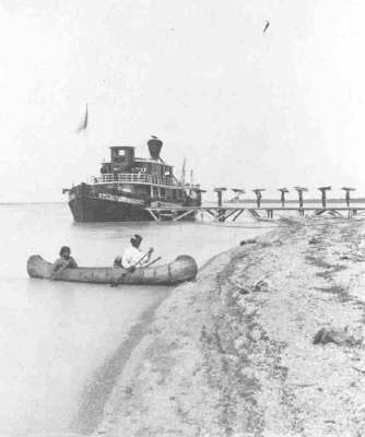 Birkenrinden-Kanu am Hudson-River um 1920. Im Hintergrund einer der ersten Flußdampfer.